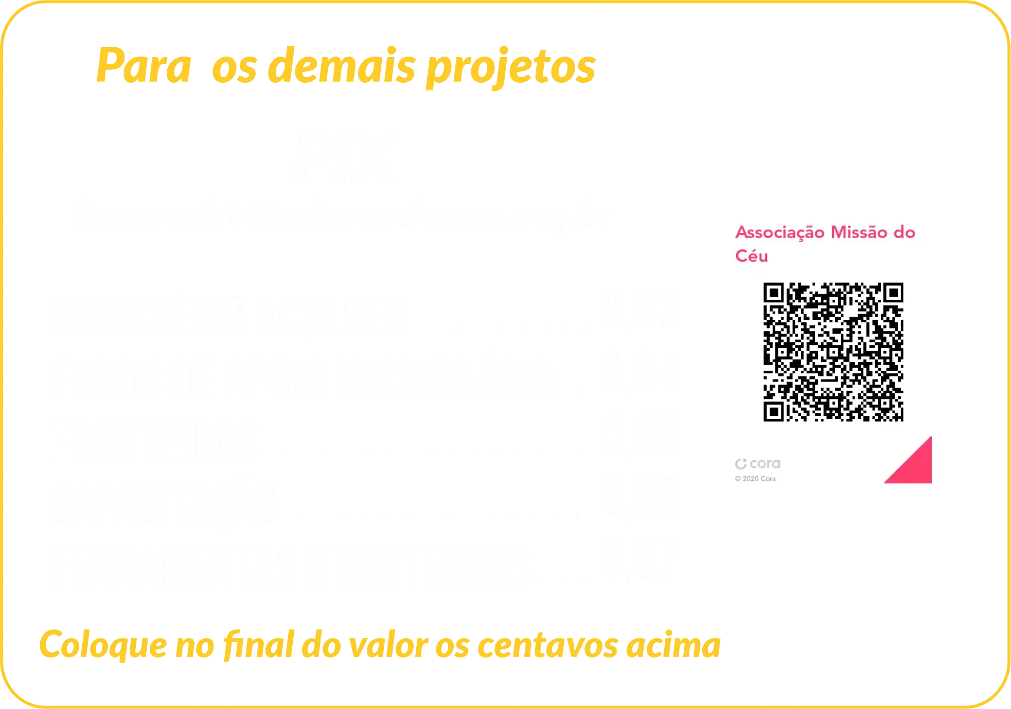 Aqui você pode doar diretamente para uma família missionária, apoiar um dos nossos projetos ativos ou contribuir com nossas campanhas especiais. Juntos, levamos esperança onde poucos conseguem chegar.